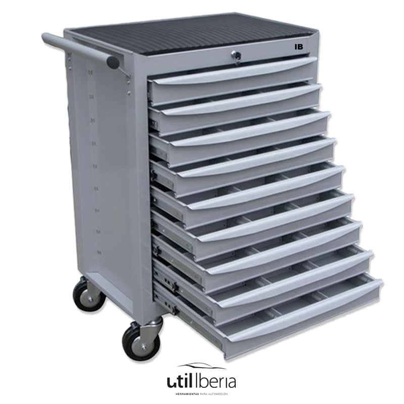 Carro de herramientas de nueve cajones con guía telescópica y separadores metálicos removibles.